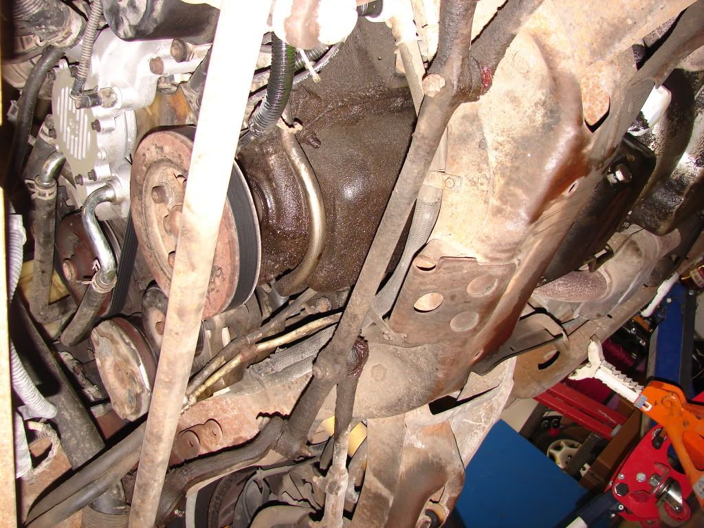 It is hard to tell from the first pic, but with a flashlight the joint between metal pipe and water pump appears to weep AF. The antifreeze is much more evident on shiny black plastic and dark metal, like near the spark plug wires.